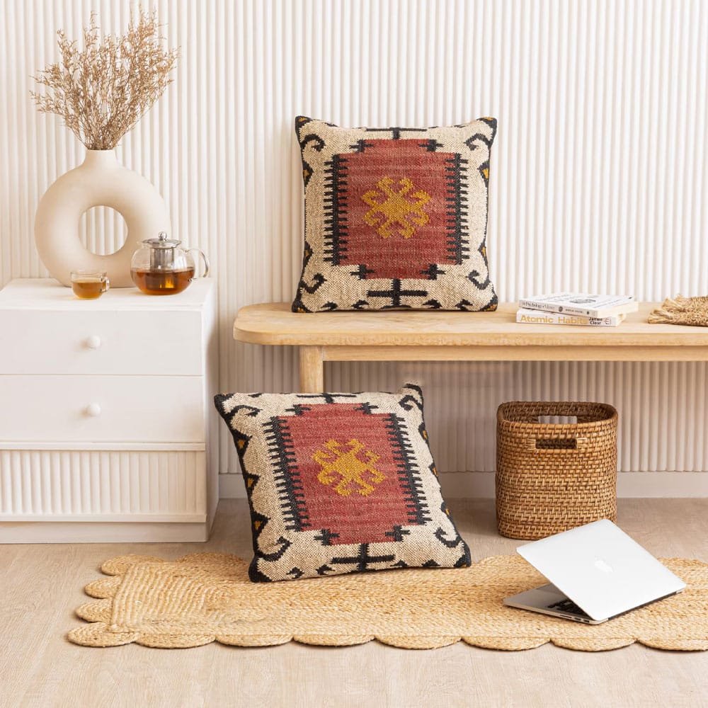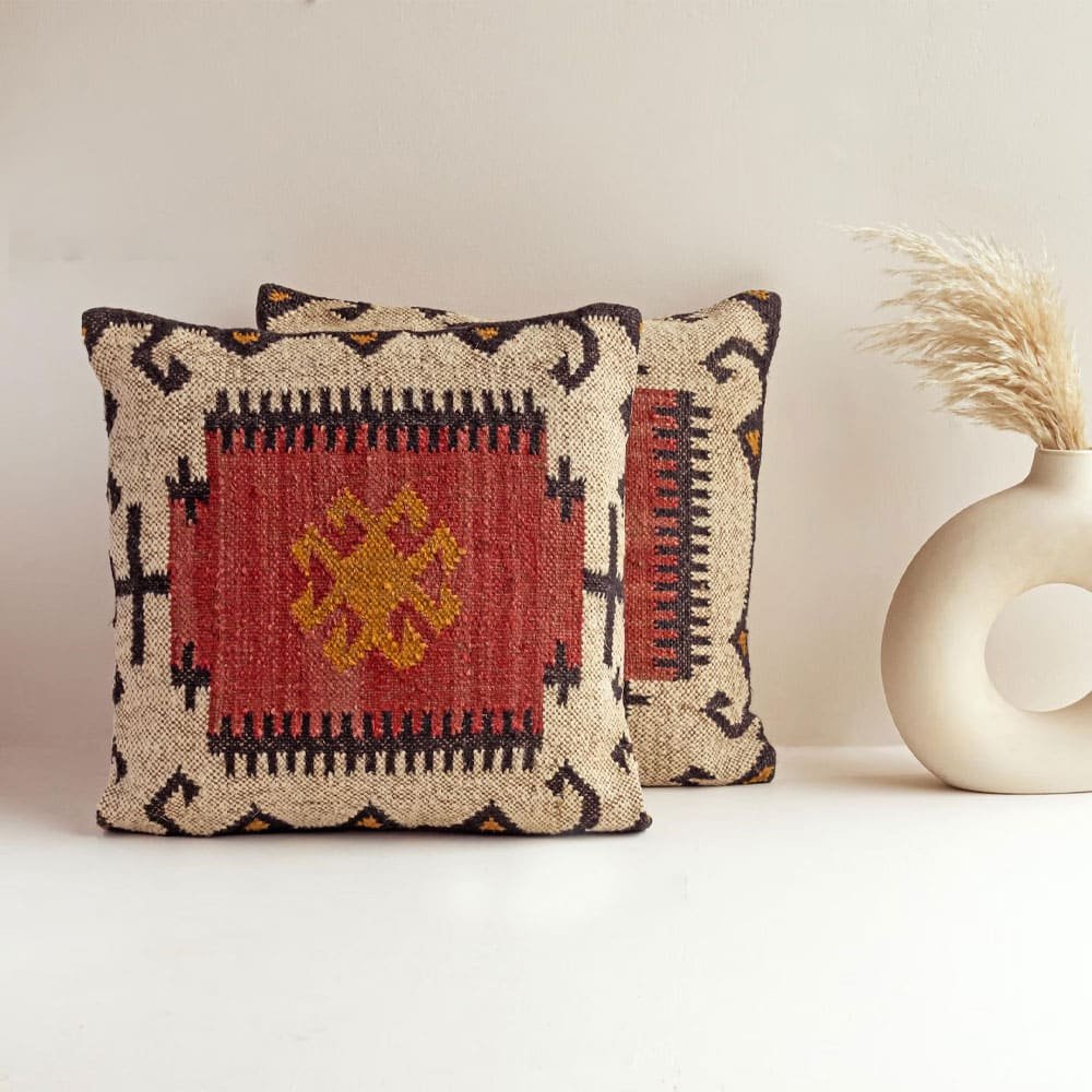 Verschönern Sie Ihren Wohnbereich mit diesen 24×24 Kelim-Kissen, die sorgfältig von Hand aus 100% natürlicher Jute gewebt wurden. Die leuchtenden Rot- und Weißtöne bringen ein modernes Bohème-Flair in jede Einrichtung. Diese einzigartigen Kissenbezüge sind ein Zeugnis traditioneller indischer Handwerkskunst und perfekt geeignet, um einen künstlerischen Akzent zu setzen.