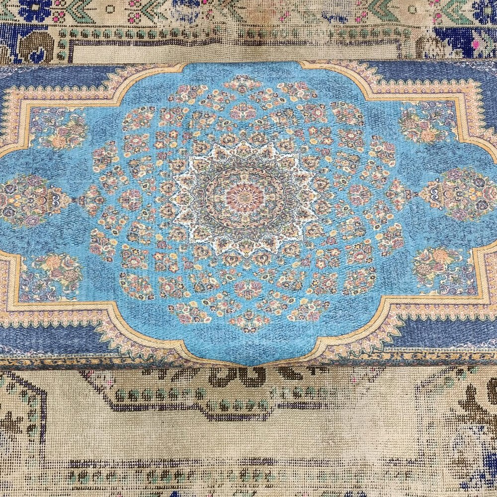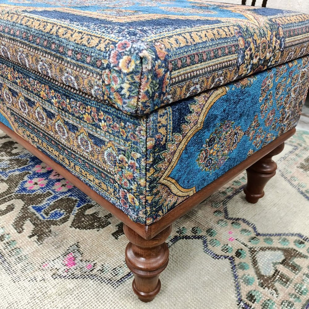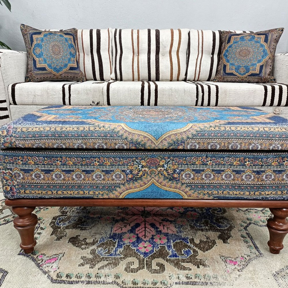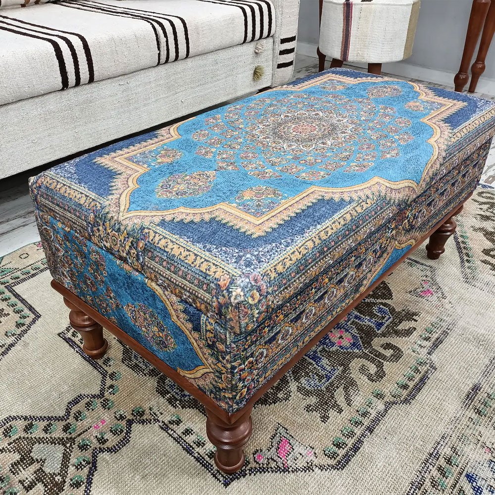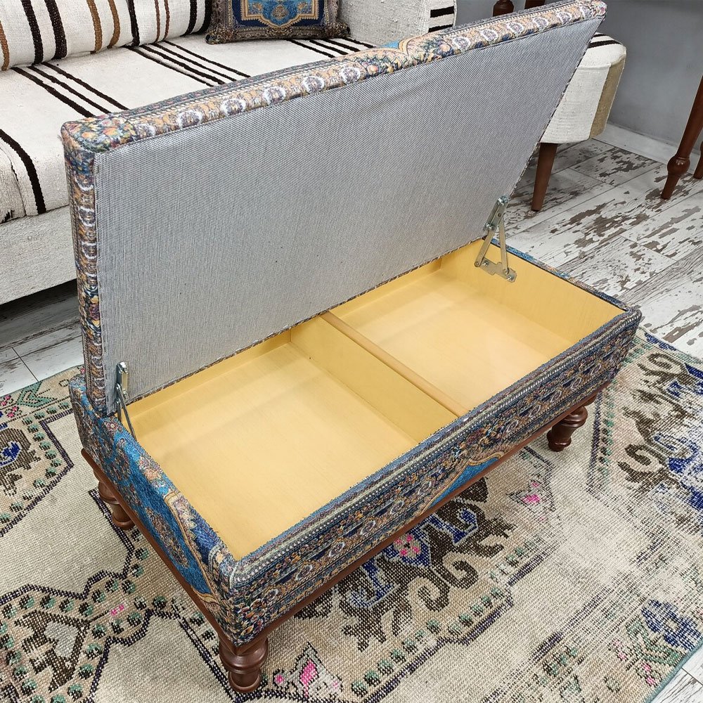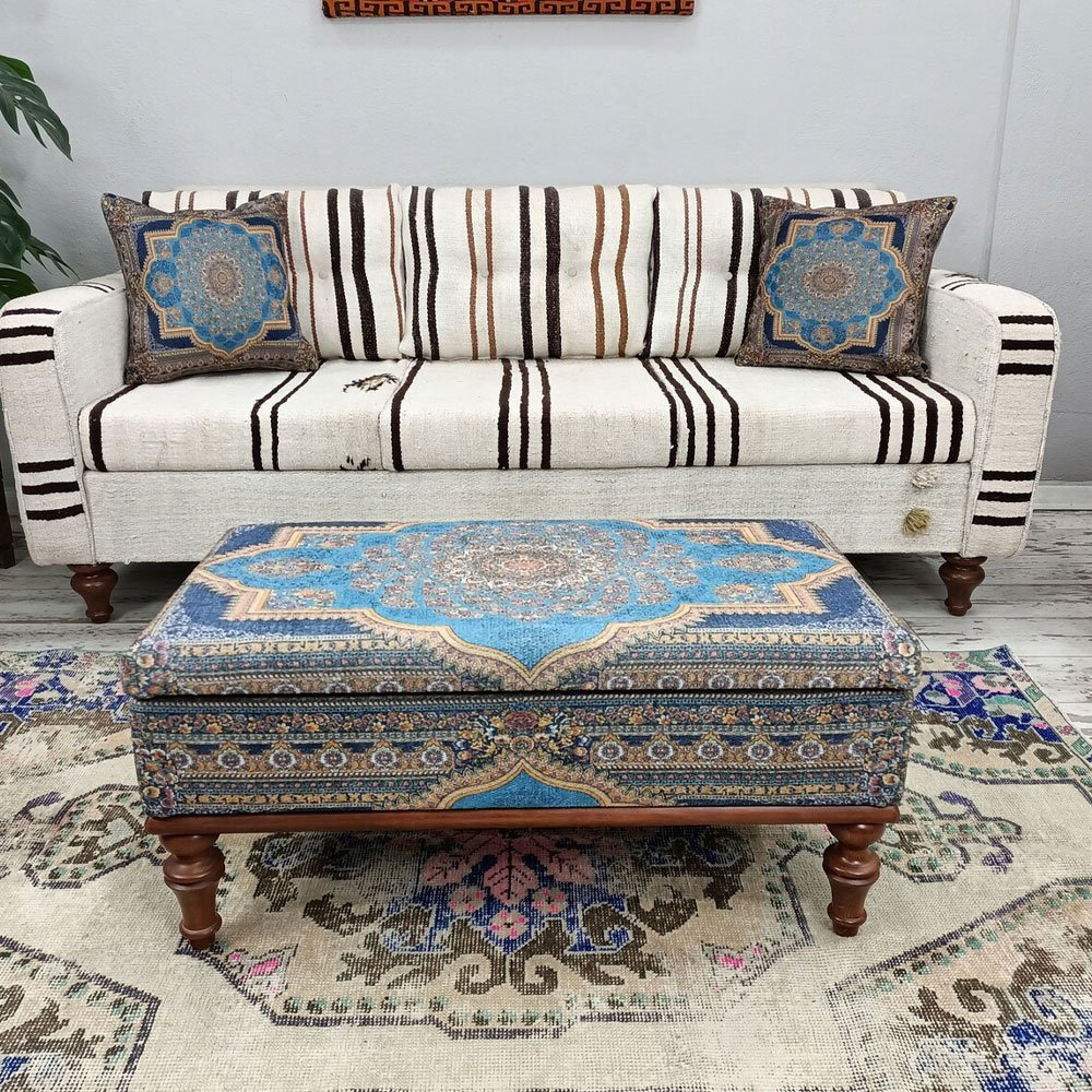 Werten Sie Ihren Wohnbereich mit unserem Blauen Türkischen Kilim Ottoman Couchtisch auf. Dieses handgefertigte Stück verbindet traditionelle Kelimkunst mit moderner Funktionalität und bietet ein geräumiges Staufach, das für Ordnung in Ihrem Bereich sorgt. Das leichte Design sorgt für einfache Mobilität, während die strapazierfähigen Materialien Langlebigkeit versprechen. Perfekt, um einen Hauch von kulturellem Charme in jeden Raum zu bringen.