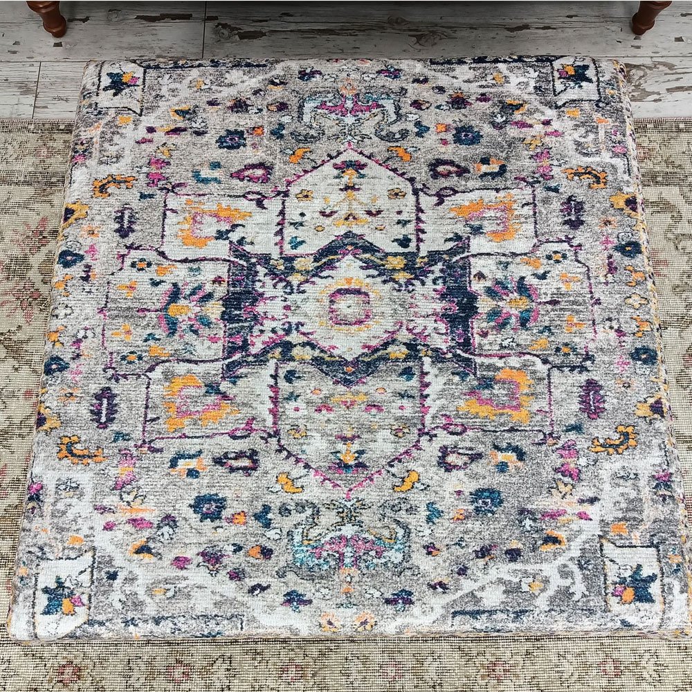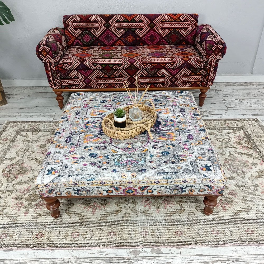 Verwandeln Sie Ihr Wohnzimmer mit diesem exquisiten grauen türkischen Kilim-Ottoman Couchtisch. Er wurde aus luxuriösen Materialien handgefertigt und kombiniert die lebendigen Muster traditioneller Kelimteppiche mit moderner Funktionalität. Dieses leichte und dennoch robuste Möbelstück ist perfekt geeignet, um jedem Zuhause einen Hauch von böhmischer Eleganz zu verleihen. Er lässt sich leicht zusammenbauen und pflegen und ist die ideale Wahl für alle, die sowohl Stil als auch Zweckmäßigkeit suchen.