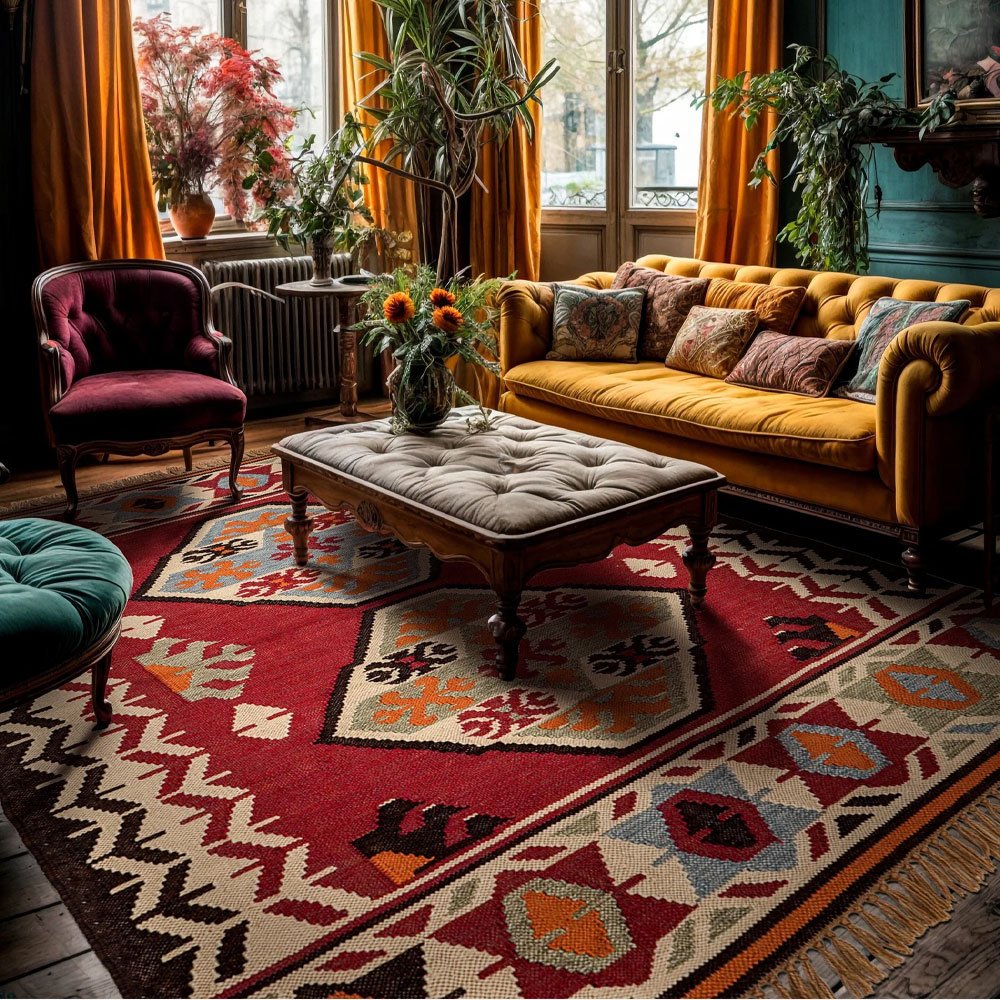 Werten Sie Ihr Zuhause mit diesem exquisiten Kilim-Teppich im Stil der amerikanischen Ureinwohner auf, der aus nachhaltigem PET-Garn hergestellt wurde. Sein handgewebtes geometrisches Muster in warmen Erdtönen verleiht jedem Raum eine gemütliche, einladende Atmosphäre. Dieser strapazierfähige und leicht zu reinigende Teppich eignet sich perfekt für Wohn- und Schlafzimmer oder Eingangsbereiche und ist eine stilvolle, umweltbewusste Wahl für Ihr Zuhause.