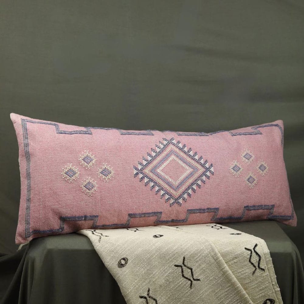 Verleihen Sie Ihrem Zuhause einen böhmischen Touch mit unserem einzigartigen rosa Kelim-Lumbar-Kissen