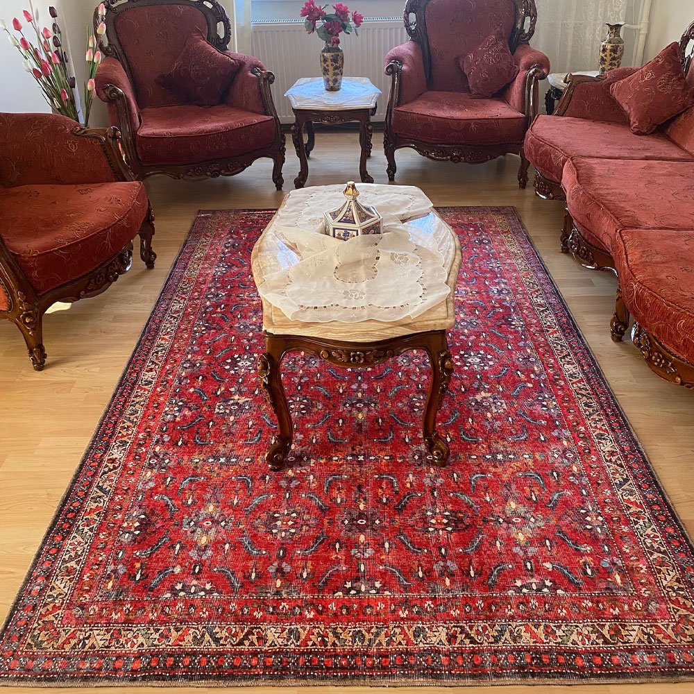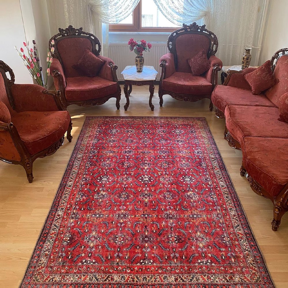 Verleihen Sie unserem roten waschbaren Teppich im Oushak-Stil einen Hauch von zeitloser Eleganz
